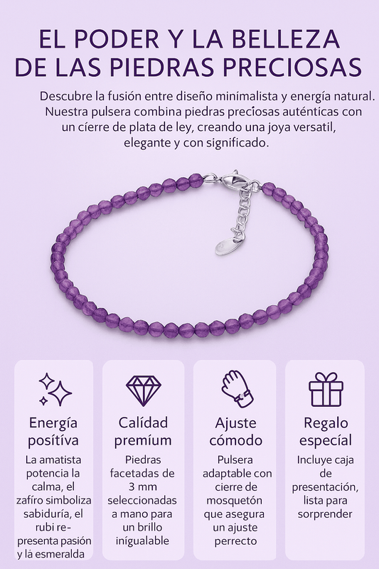 Elegante pulsera de piedras preciosas: rubí, zafiro, esmeralda o amatista natural. Piedras redondas facetadas de 3 mm, 17 cm con cierre de mosquetón.